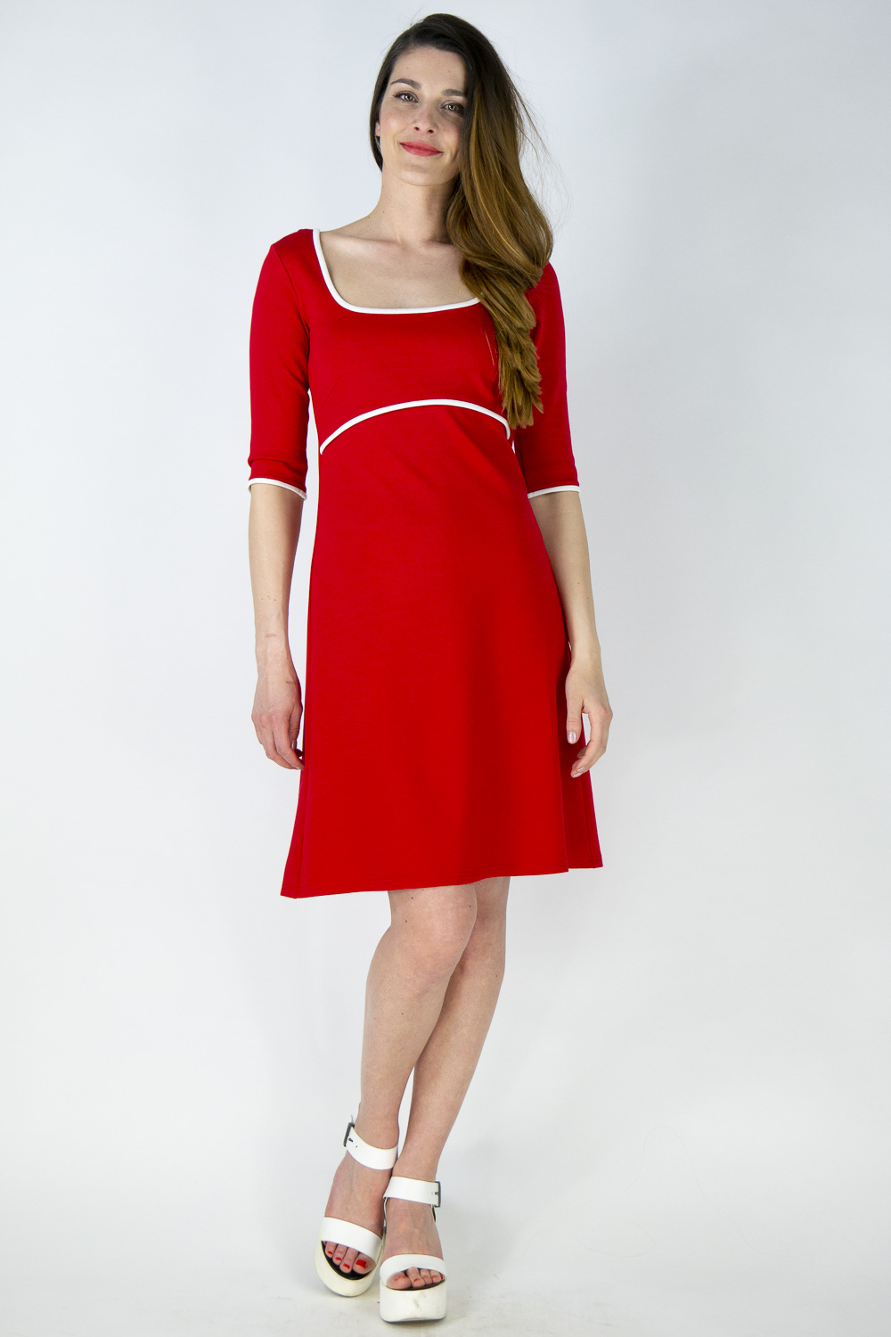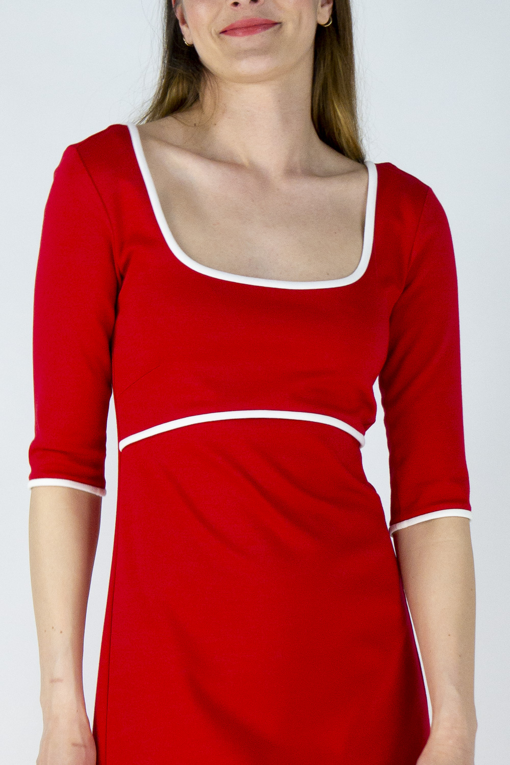 Die Taille rückt durch die Linie unter der Brust optisch nach oben und sorgt für lange Beine. Im Oberteil ist es anliegend, der Rock hat eine A-Linie. Der Ausschnitt ist großzügig, damit nichts verrutscht gibt es verdeckt eingearbeitete Clipse zur Befestigung am BH- Träger. Der Ausschnitt ist im Vorderteil eckig gearbeitet, im Rücken spitz zulaufend. Die Rückenpartie ist atemberaubend und zeigt viel Haut, der Ausschnitt endet jedoch vor der BH-Linie. Kombinieren Sie an kühlen Tagen einen unserer großzügigen Loopschals und Wendestulpen dazu.
