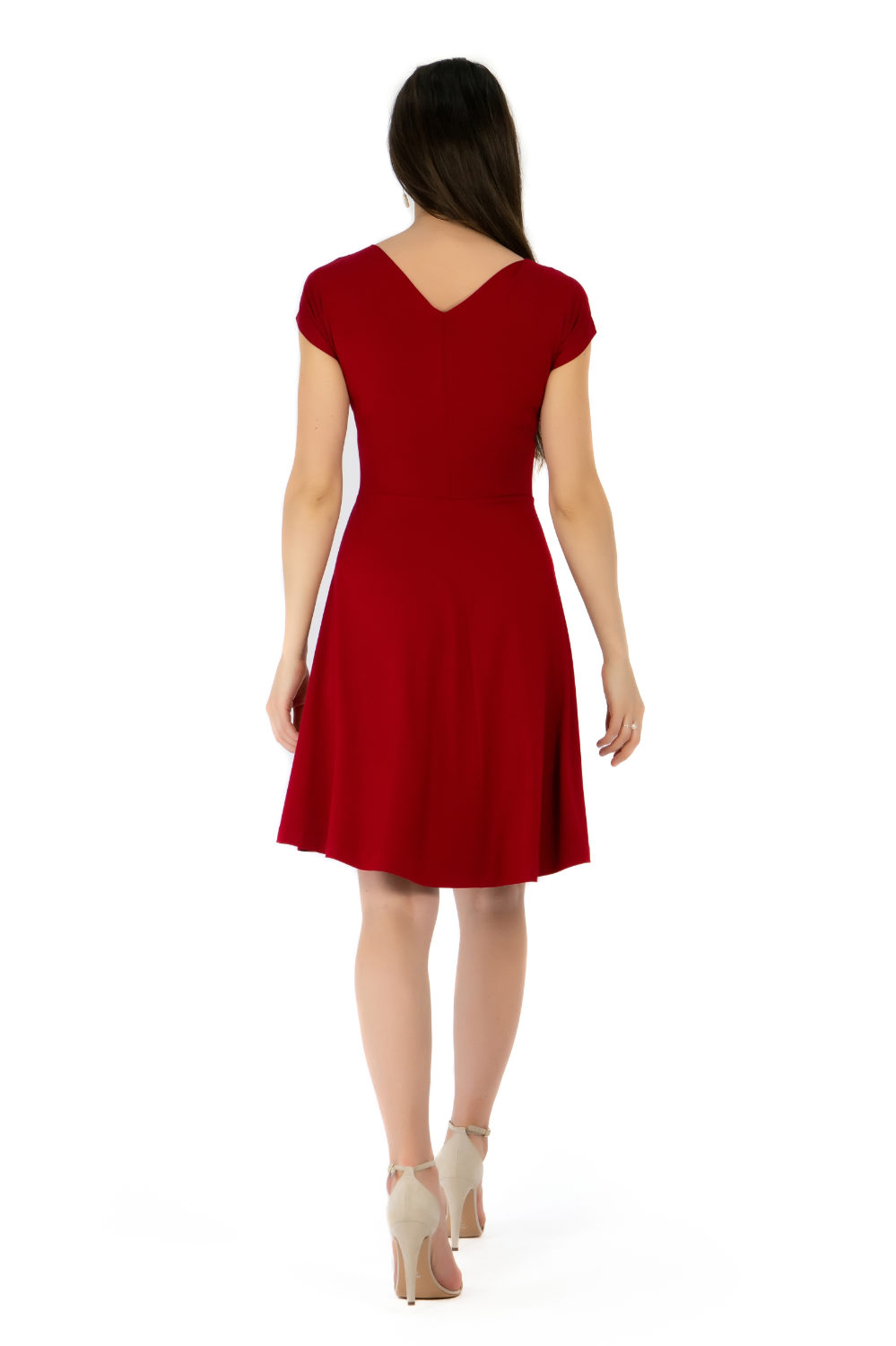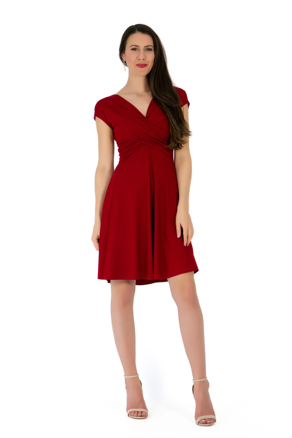 Der Ausschnitt ist vorne und hinten V-förmig und in der Größe dadurch etwas variabel. Die Drapierung eignet sich für kleinere und größere Körbchengrößen.
