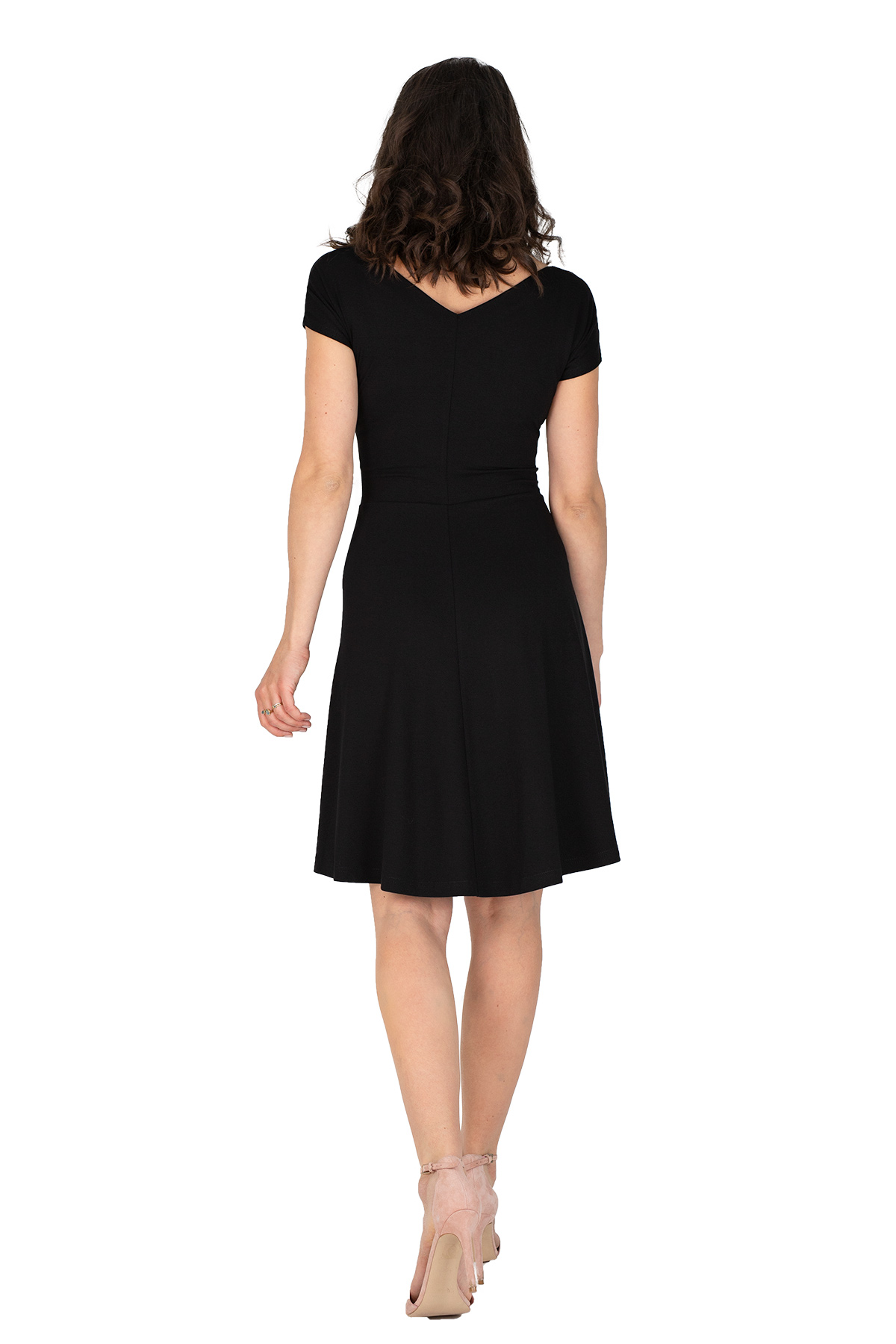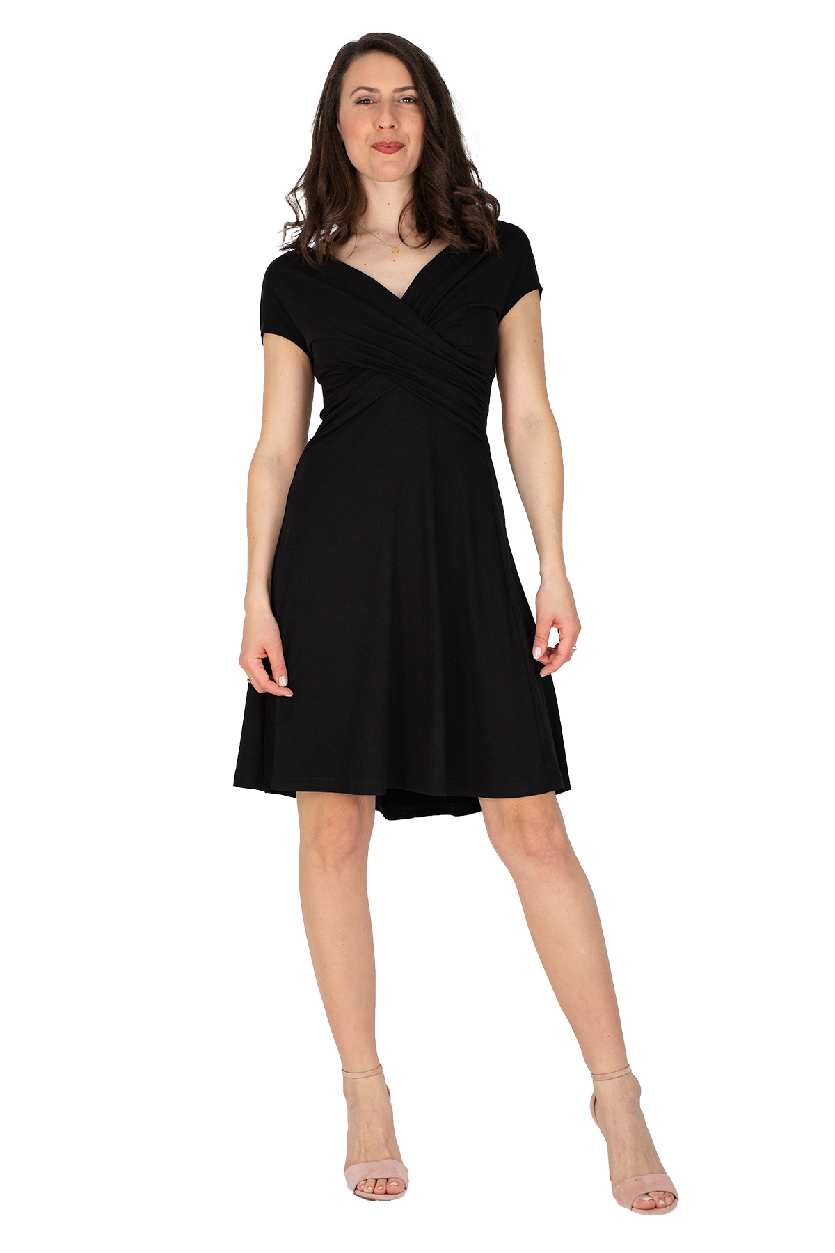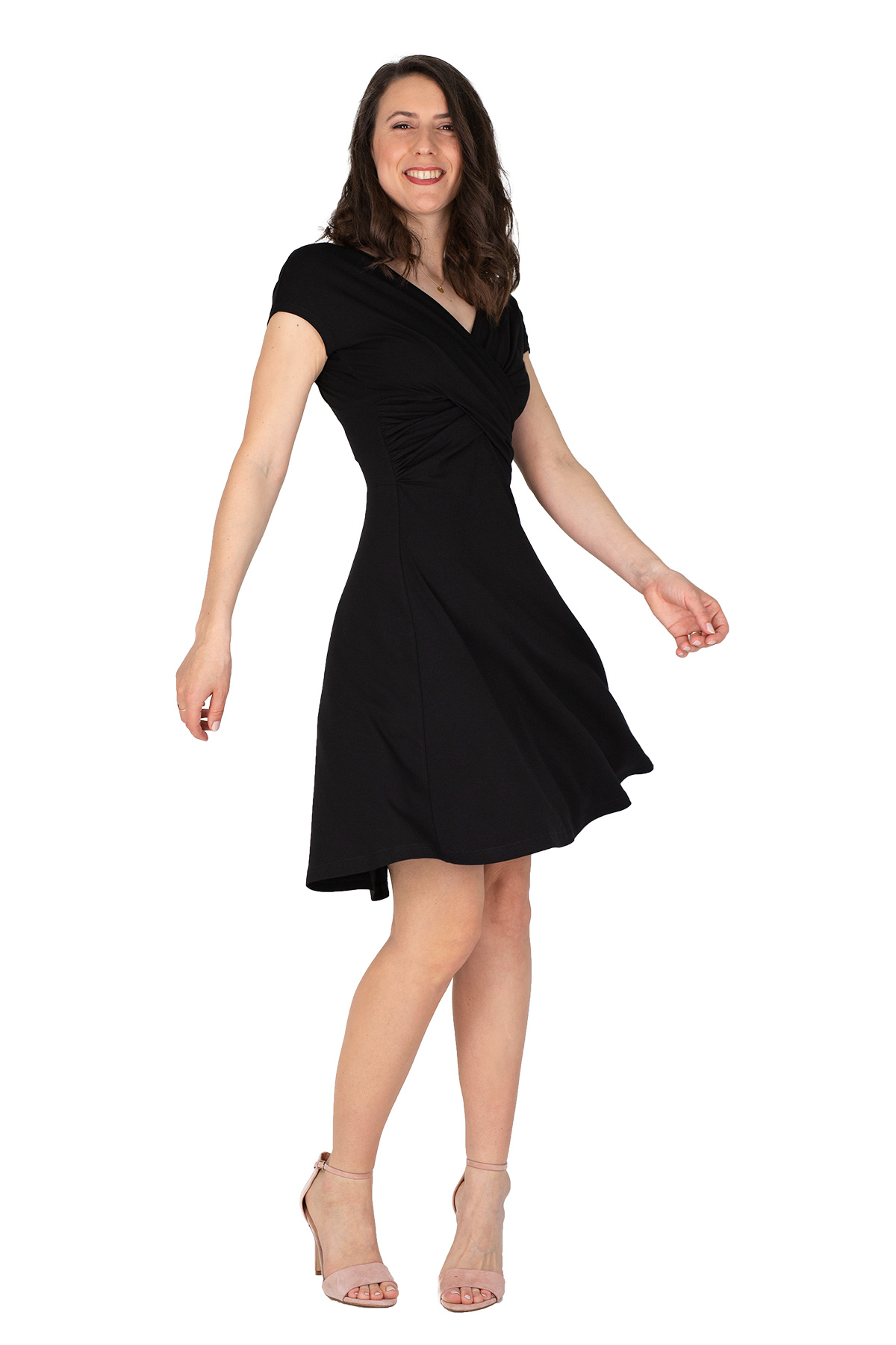 Der Ausschnitt ist vorne und hinten V-förmig und in der Größe dadurch etwas variabel. Die Drapierung eignet sich für kleinere und größere Körbchengrößen.