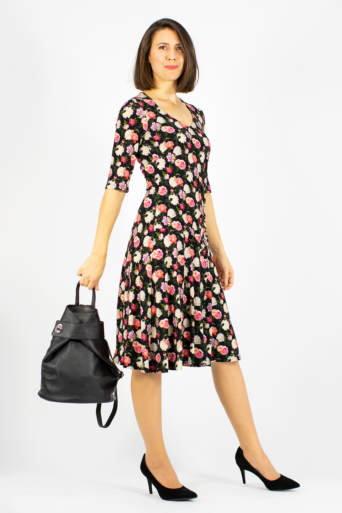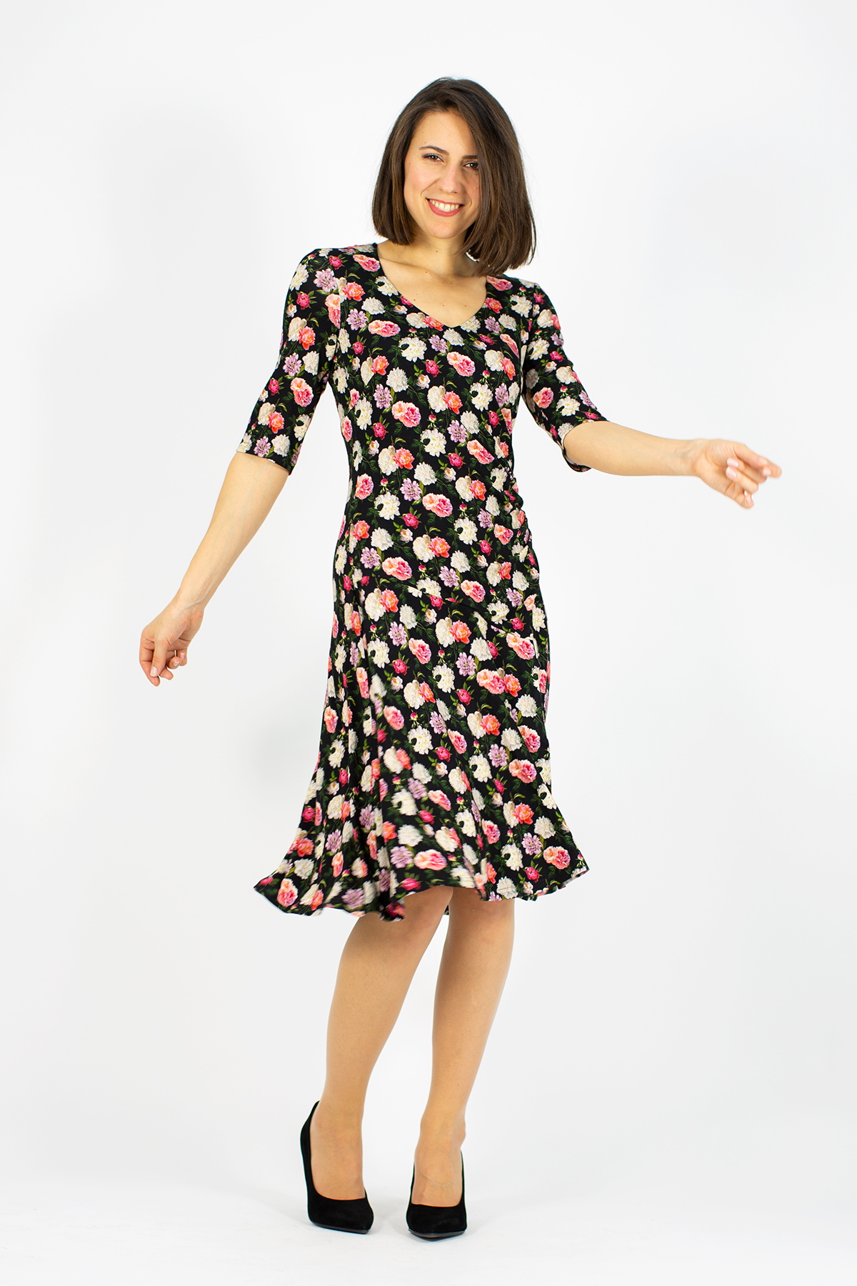 Das Rockteil ist ebenfalls dezent asymmetrisch, ein Schlitz in dem wunderbar weit schwingenden Rock zeigt in der Bewegung etwas Bein. Lebensfreude pur…!