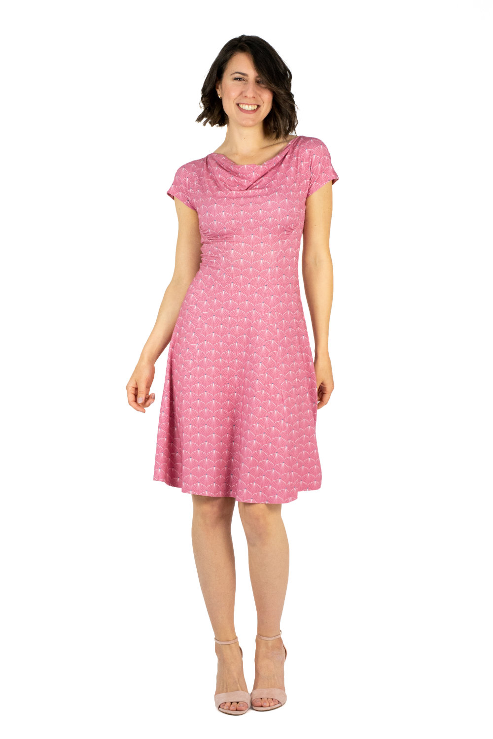 Der wunderbar weich fallende Ausschnitt umspielt ihr Dekolleté. Das kurze Ärmelchen ist angeschnitten und passt damit zu schmalen aber auch breiteren Schultern.