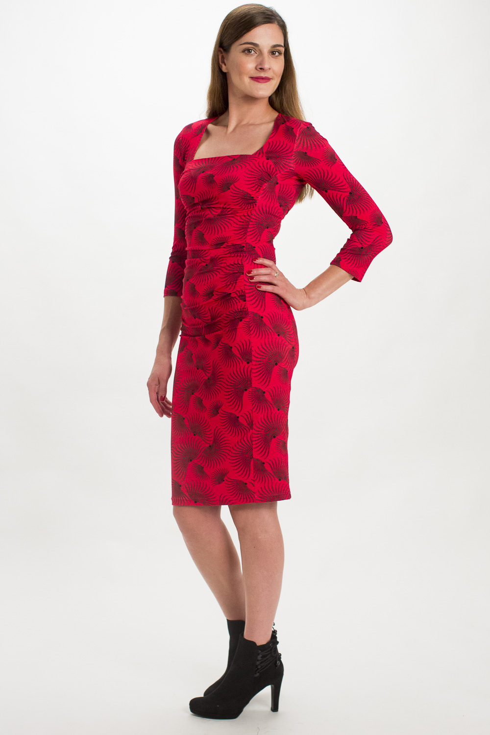 Unser schmales Basic-Kleid. Der Schnitt zeigt viel Liebe zum Detail. Die Raffung im Vorderteil kaschiert weibliche Rundungen perfekt. Die formgebenden Längsnähte strecken die Figur. Im Rücken gibt es in der Taille eine kleine Raffung. Die Passenabtrennung im oberen Bereich ist nicht nur dekorativ sondern auch perfekt platziert. Sie kaschiert die darunterlegende BH-Linie perfekt!