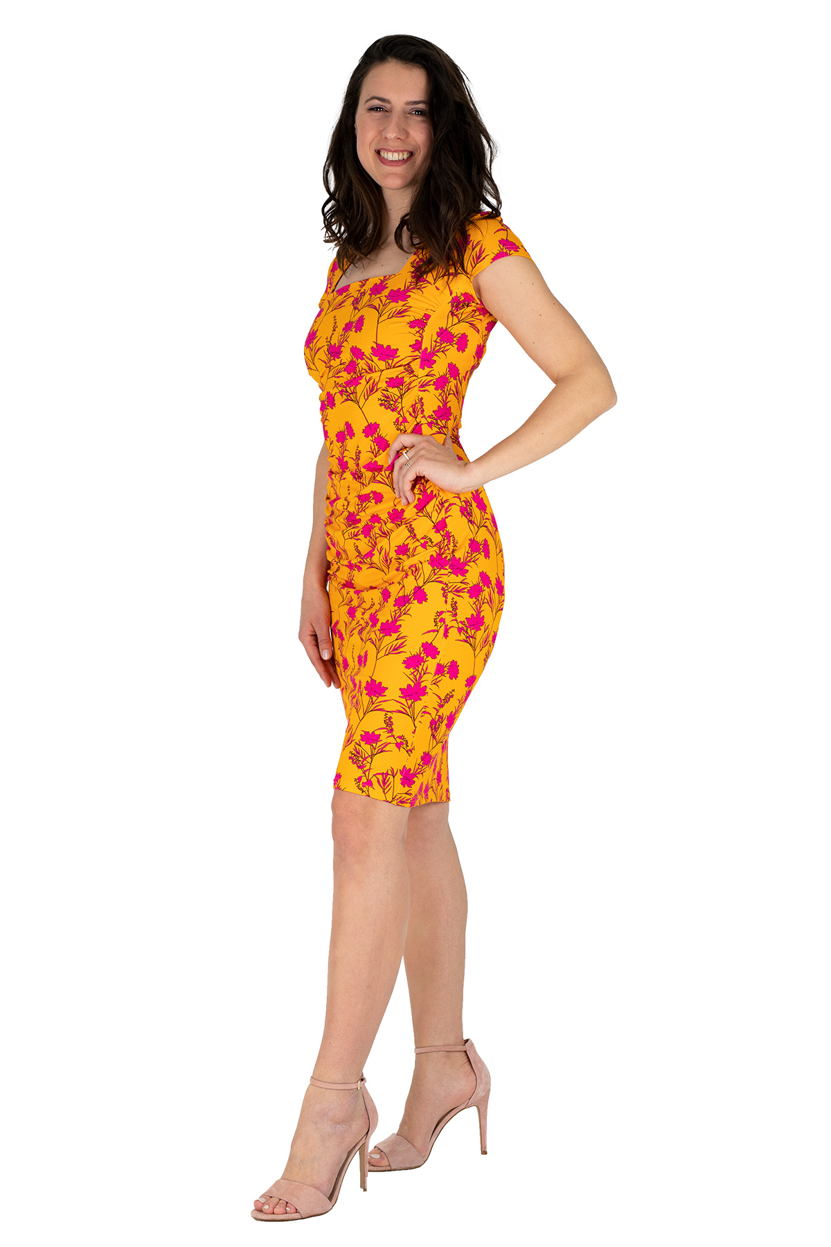 Das Kleid hat einen sommerlichen Kurzarm.