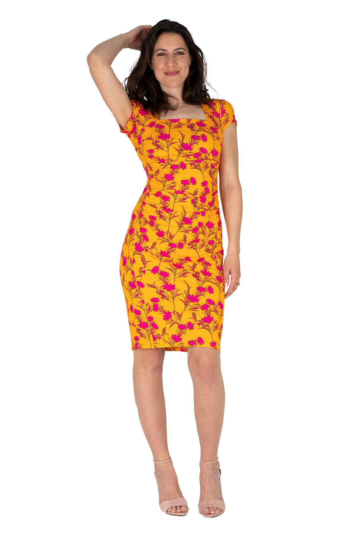 Unser schmales Basic-Kleid. Der Schnitt zeigt viel Liebe zum Detail. Die Raffung im Vorderteil kaschiert weibliche Rundungen perfekt. Die formgebenden Längsnähte strecken die Figur. Im Rücken gibt es in der Taille eine kleine Raffung. Die Passenabtrennung im oberen Bereich ist nicht nur dekorativ sondern auch perfekt platziert. Sie kaschiert die darunterlegende BH-Linie perfekt!