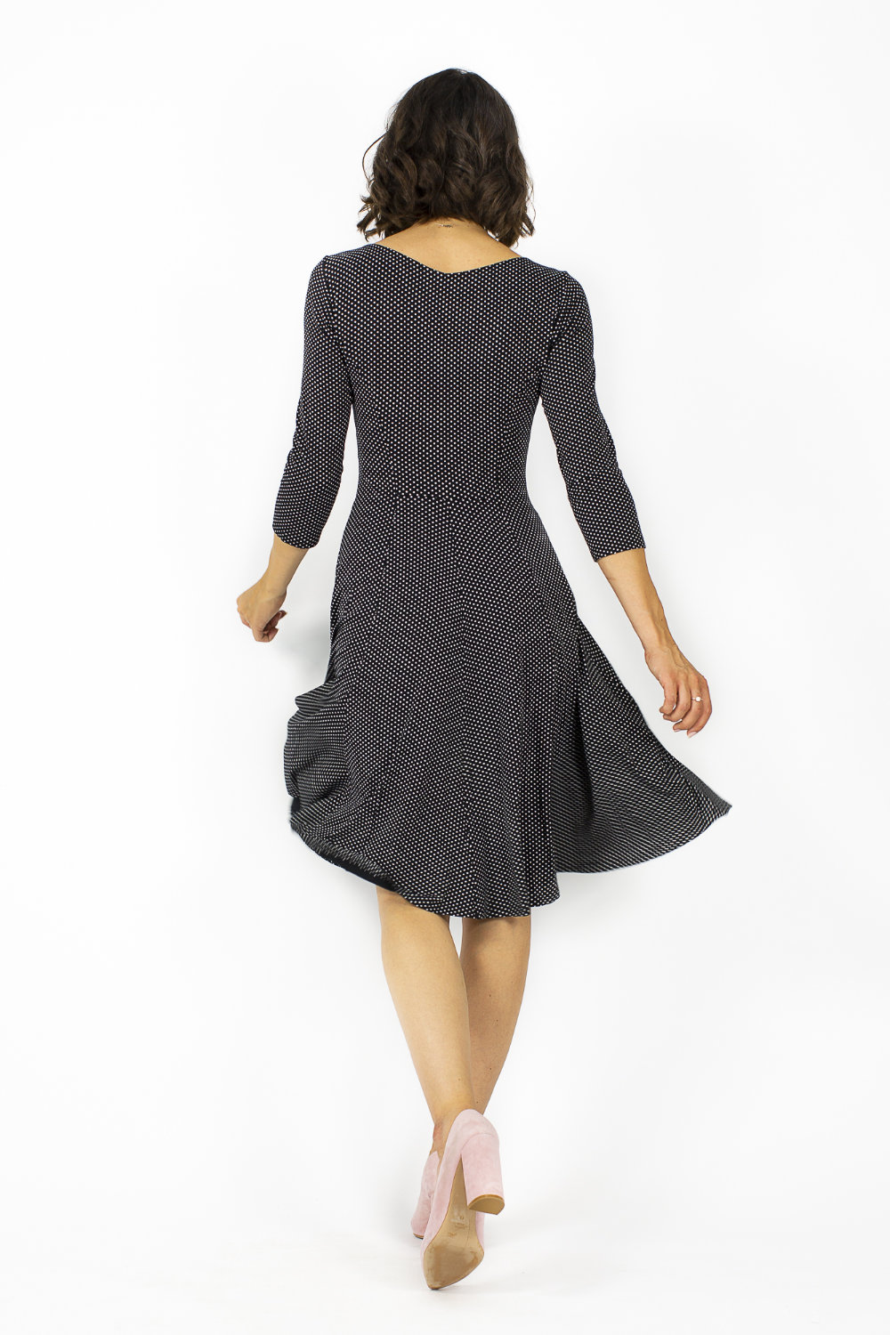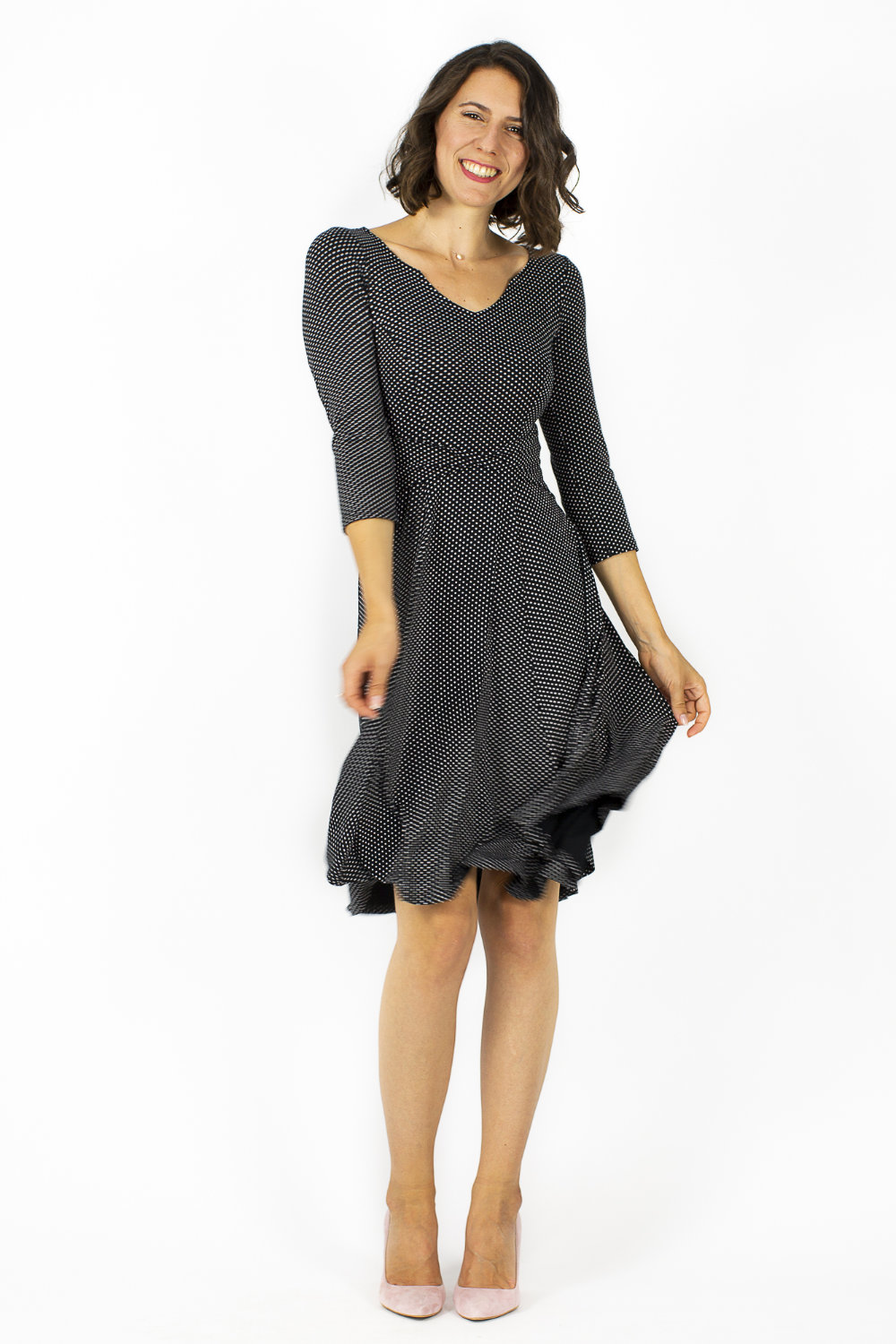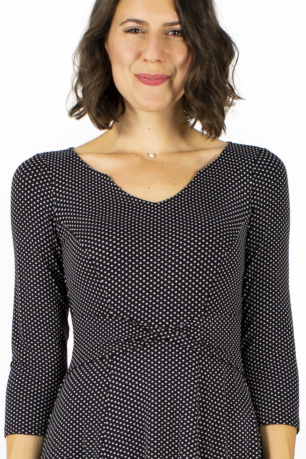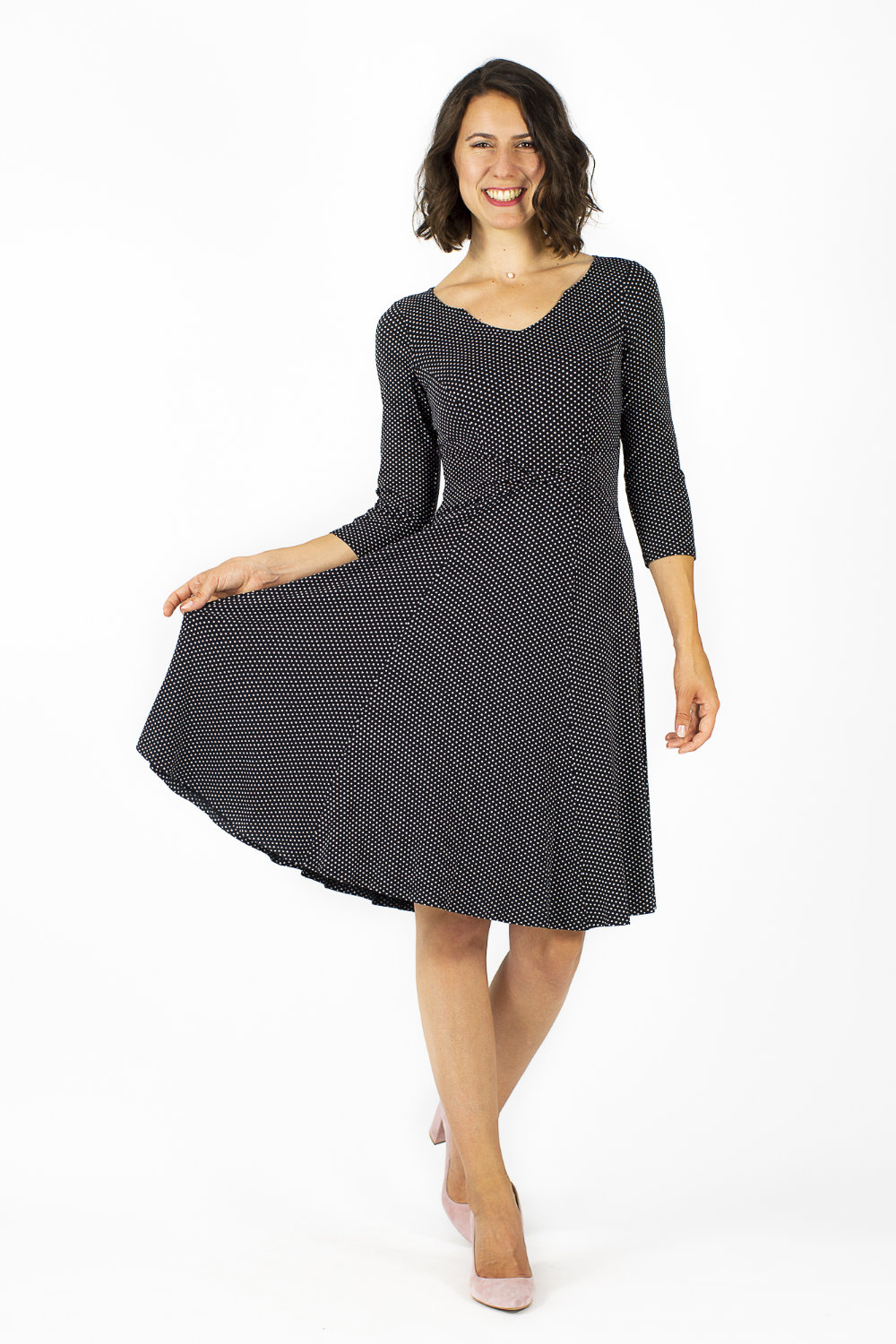 Der außergewöhnlich schöne Ausschnitt setzt ihr Dekolleté in Szene. Prinzessnähte sorgen für eine optimale Passform und strecken die Figur. Der raffinierte Gürtel Wendegürtel zaubert eine Wespentaille. Für eine ruhigere Vorderansicht kann der Gürtel auch im Rücken getragen werden. Weibliche Hüften werden von dem glockigen Rock weich umspielt. Der Saum hat eine schwingende Weite und lädt zum Tanzen ein. Die Ärmellänge ist dreiviertel lang.