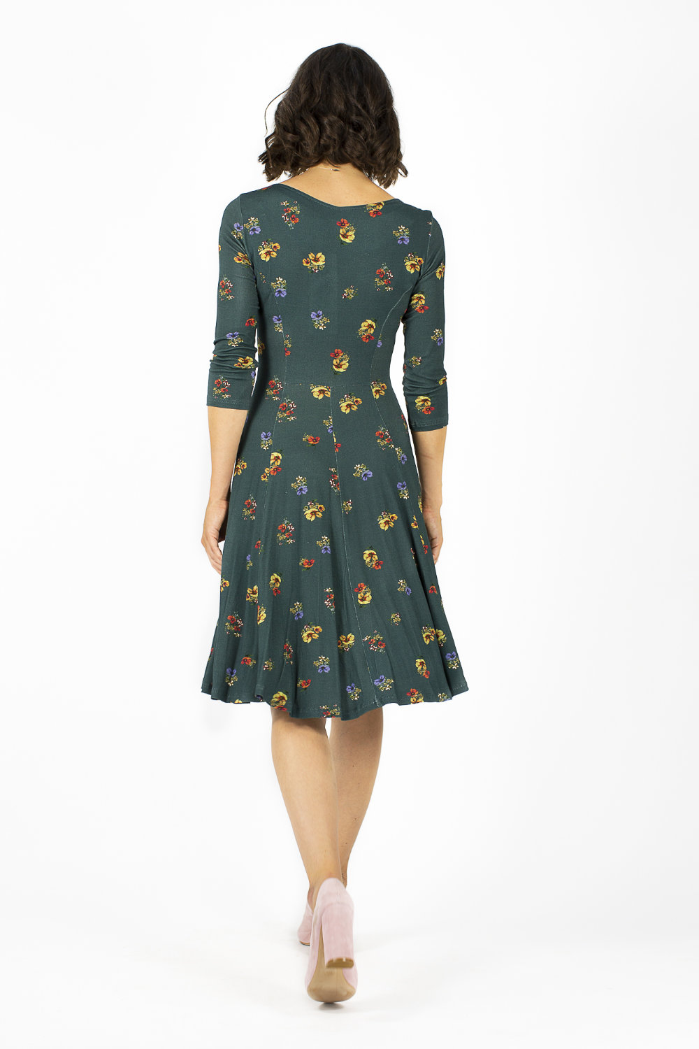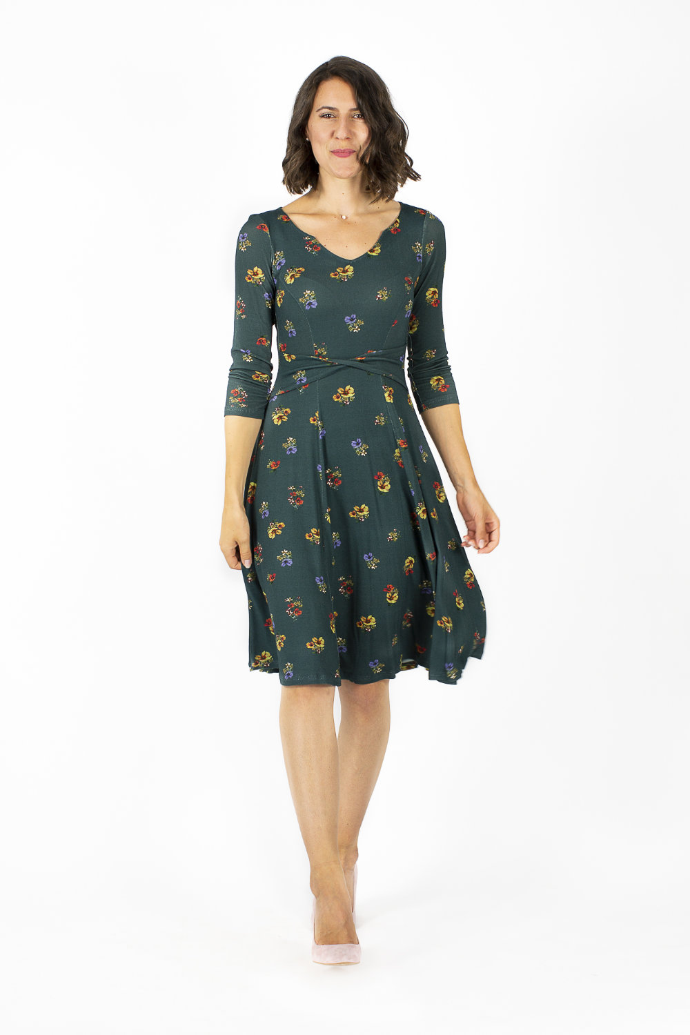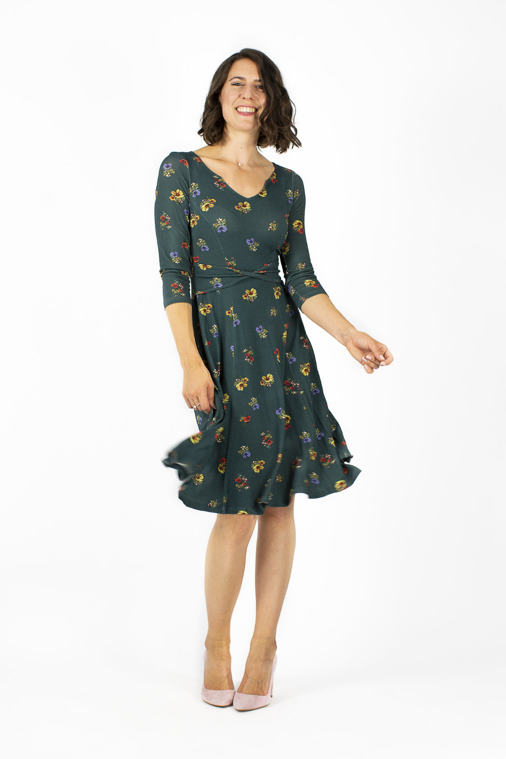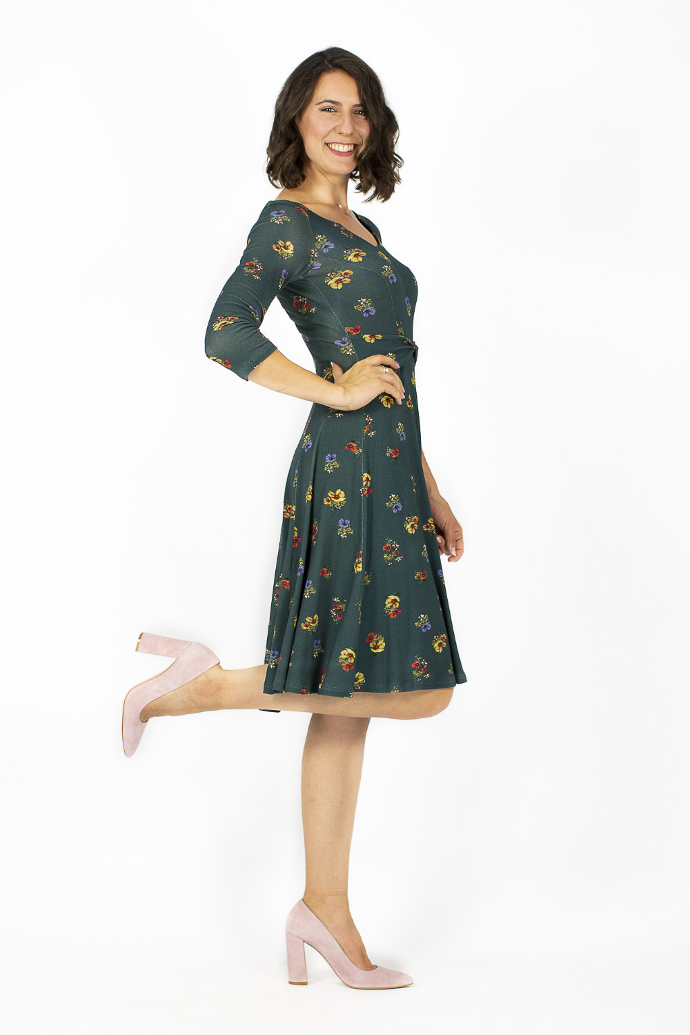 Der außergewöhnlich schöne Ausschnitt setzt ihr Dekolleté in Szene. Prinzessnähte sorgen für eine optimale Passform und strecken die Figur. Der raffinierte Gürtel Wendegürtel zaubert eine Wespentaille. Für eine ruhigere Vorderansicht kann der Gürtel auch im Rücken getragen werden. Weibliche Hüften werden von dem glockigen Rock weich umspielt. Der Saum hat eine schwingende Weite und lädt zum Tanzen ein. Die Ärmellänge ist dreiviertel lang.