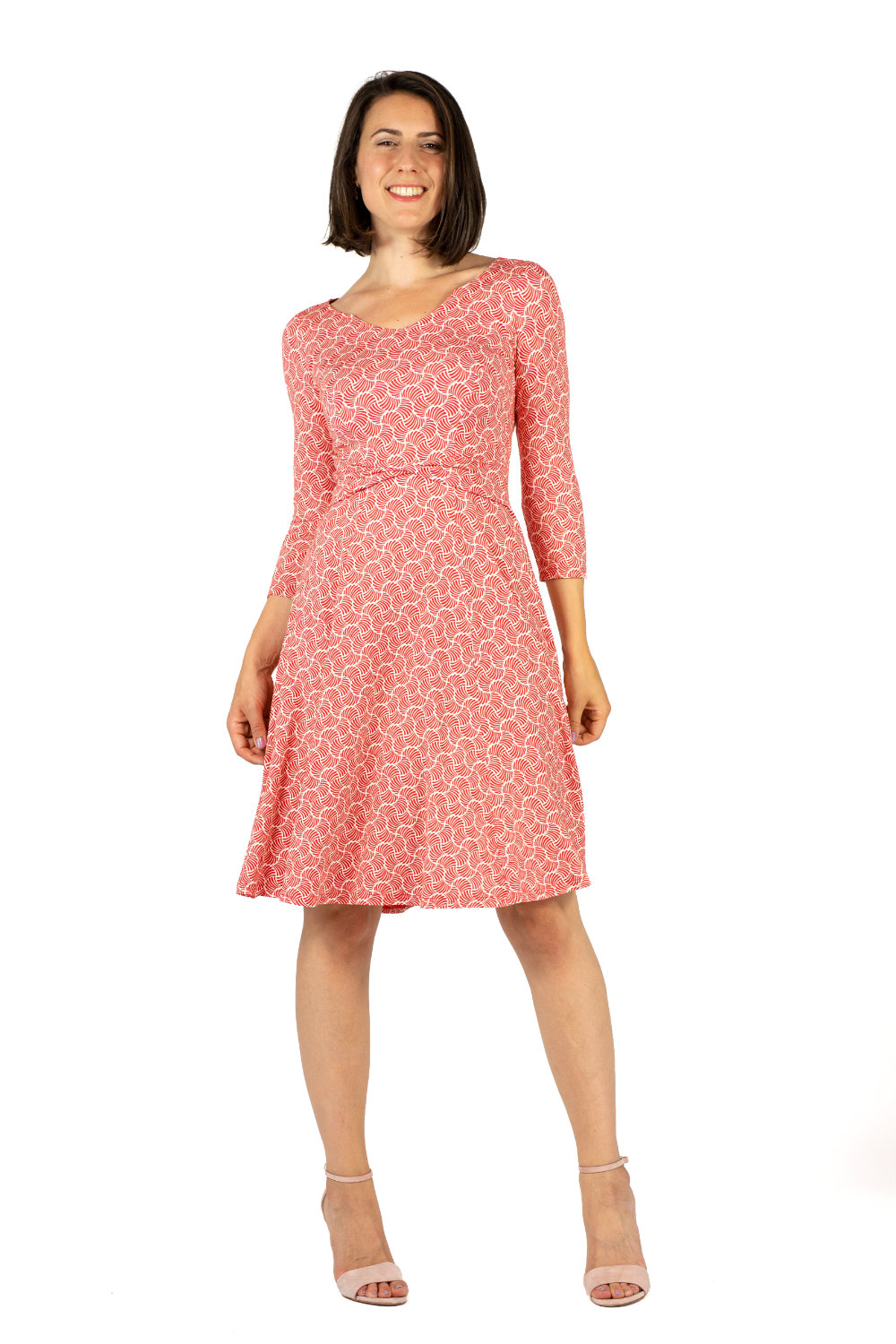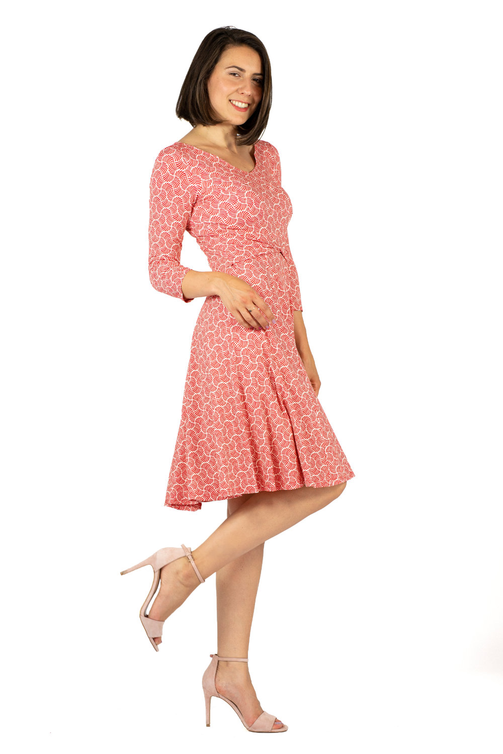 Der außergewöhnlich schöne Ausschnitt setzt ihr Dekolleté in Szene. Prinzessnähte sorgen für eine optimale Passform und strecken die Figur. Der raffinierte Gürtel Wendegürtel zaubert eine Wespentaille. Für eine ruhigere Vorderansicht kann der Gürtel auch im Rücken getragen werden. Weibliche Hüften werden von dem glockigen Rock weich umspielt. Der Saum hat eine schwingende Weite und lädt zum Tanzen ein. Die Ärmellänge ist dreiviertel lang.